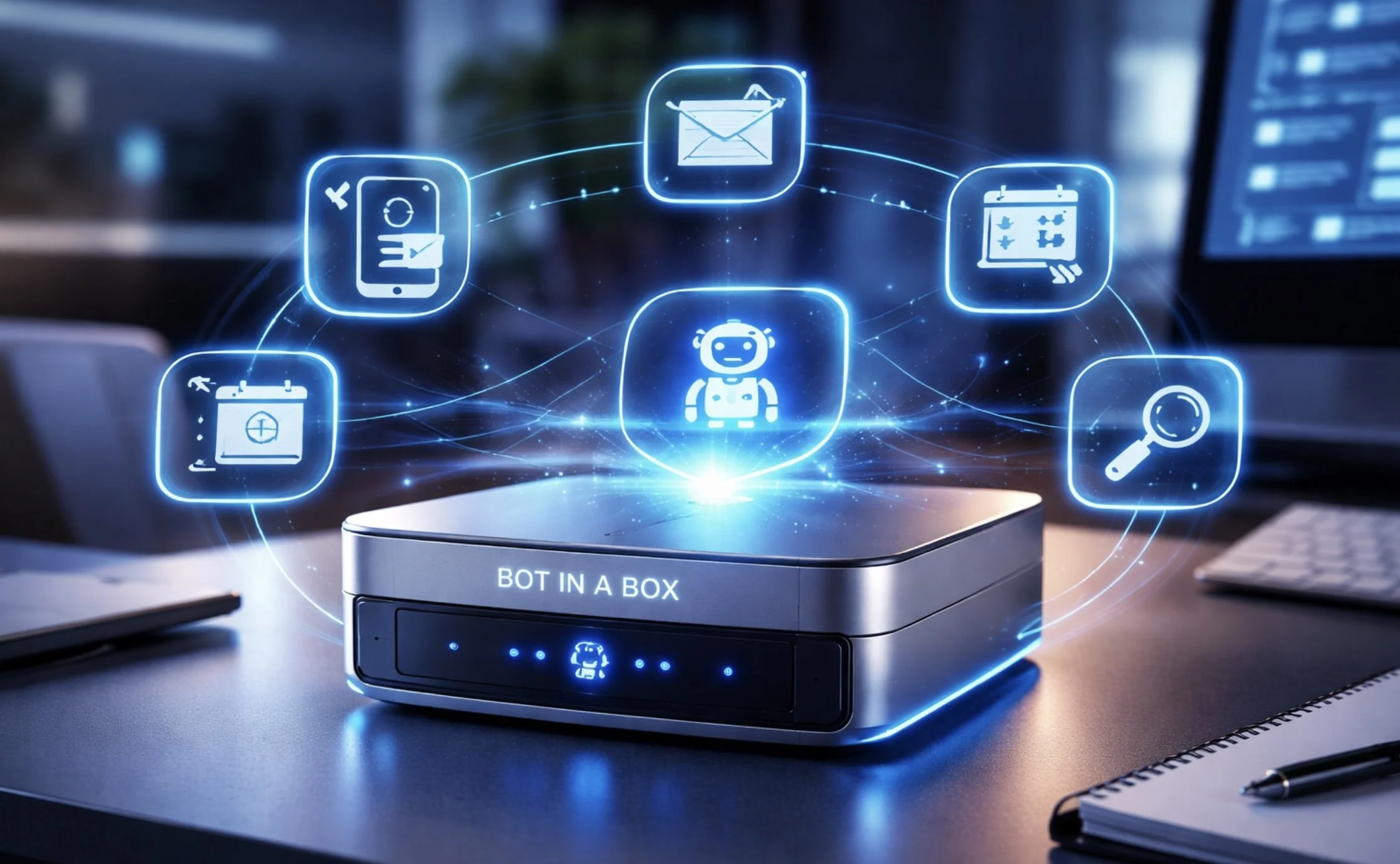 Bot in a Box is a dedicated AI operations unit delivered on its own secure hardware appliance. Simply connect a keyboard, mouse and display.